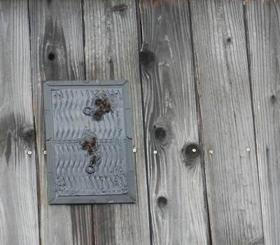 近江八幡市でスズメバチ駆除 今回も焼板の中に作ったスズメバチ駆除です。 焼板の抜けたフシのところからスズメバチが出入りしてます。 焼板に切り込みを入れて板を捲ってます。 スズメバチの巣が出て来ました。 除去したスズメバチの巣です。 捲った焼板を張り直し 出入りしていたところに粘着シートを貼り、戻りバチも駆除します。