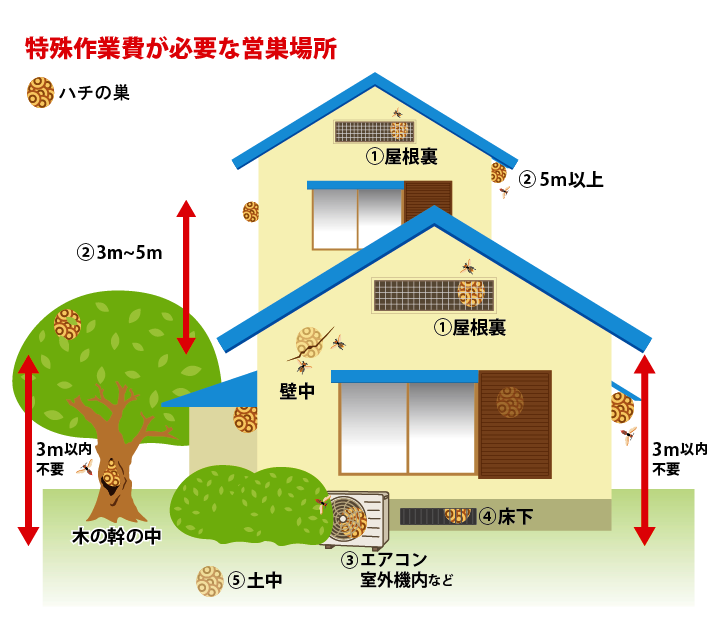 ハチの巣が出来ている場所が下記の場合、基本料金 + 該当の特殊作業費を頂戴いたします。